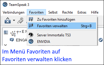 Startet die Teamspeak Software und klickt im Menü zuerst auf den Eintrag Favoriten.