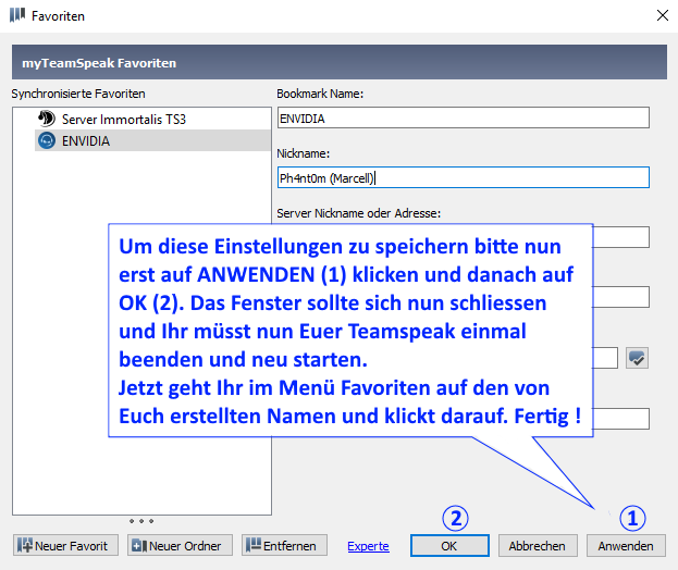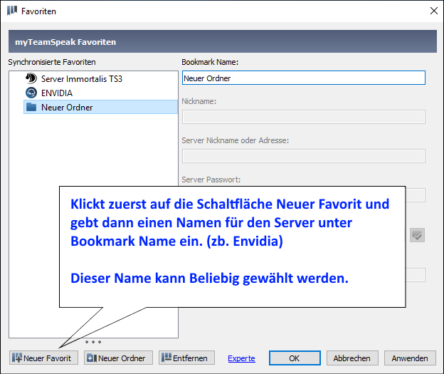 In dem neuen Fenster gebt Ihr in dem Feld unter Bookmark einen Namen für den neuen Server ein.