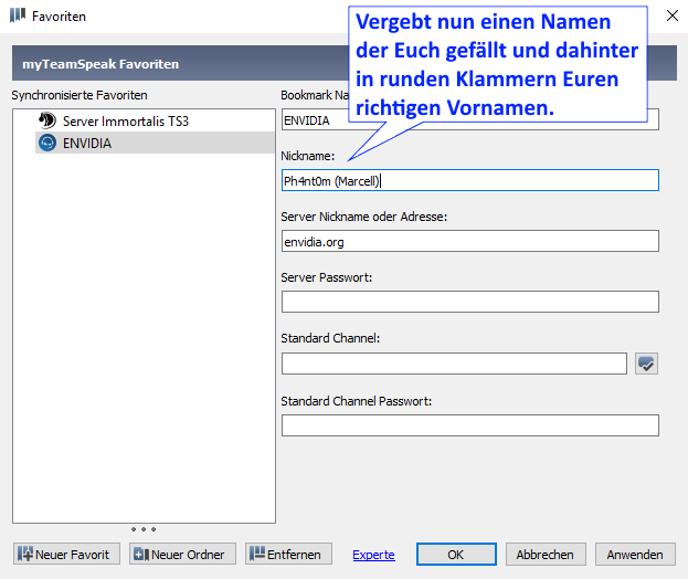 Hinter diesen Namen lasst Ihr ein Leerzeichen und fügt Euren realen Vornamen in runden Klammern ein.