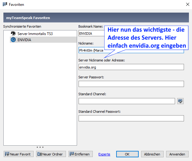 In dem Feld Server Nickname oder Adresse muss nun die Adresse eingetragen werden. Diese Adressen können